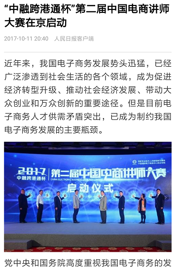 电子商务中心高度重视创新人才培养模式,为发现培养电子商务讲师人才,提高全国电子商务培训整体水平,打造有影响力的电子商务培训服务体系,促进地方电子商务发展,中国国际电子商务中心联合地方政府、合作机构和权威媒体在2016年成功举办首届中国电商讲师大赛的基础上,在2017年推出“中融跨港通杯”第二届中国电商讲师大赛,活动面向全国高等院校、职业院校、行业组织、培训机构的电商讲师以及有志投入电商培训行业的优秀人才。