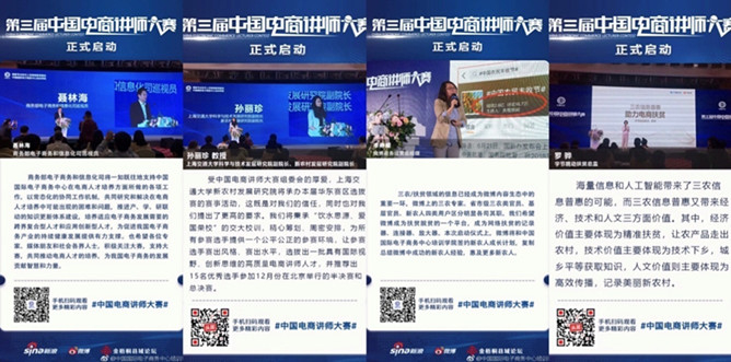 9月26日上午,第三届中国电商讲师大赛启动仪式在京隆重举行,吸引了包括CCTV-7、人民网、央视网、新浪网、腾讯视频、爱奇艺等主流媒体、网络媒体争相报道。启动仪式上,中国国际电子商务中心与新浪微博签署了战略合作协议,双方将共同推广中国电商讲师大赛,并共同发起“新农人成长计划”。CCTV-7农业节目《每日农经》栏目制片人周祚、微博政务运营总经理李峥嵘、字节跳动扶贫总监罗骅在启动仪式进行了主题发言,将全力支持大赛的宣传推广。