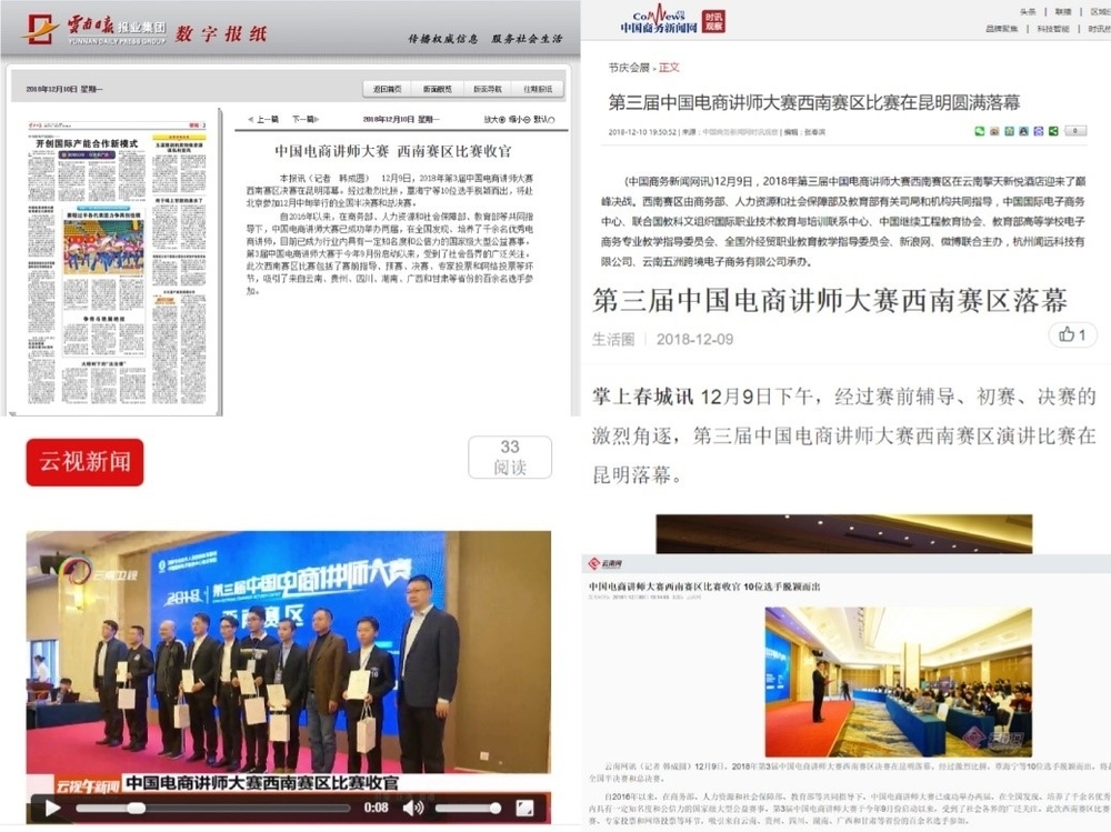12月8日-9日,第三届中国电商讲师大赛西南赛区比赛在昆明成功举办。本次比赛由中国国际电子商务中心、联合国教科文组织国际职业技术教育与培训联系中心、中国继续工程教育协会、教育部高等学校电子商务专业教学指导委员会、全国外经贸职业教育教学指导委员会、新浪网、微博联合主办,杭州闻远科技有限公司、云南五洲跨境电子商务有限公司承办。