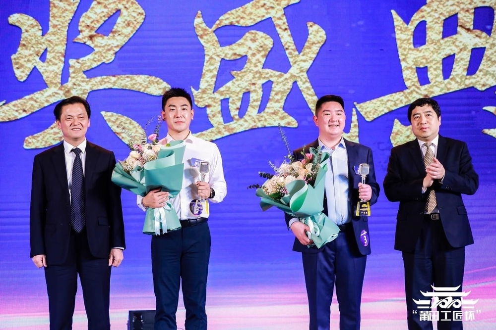 全国总冠军、特等奖获得者马焘(中)、一等奖获得者张满洋(左)、李权龙(右)接受大赛荣誉