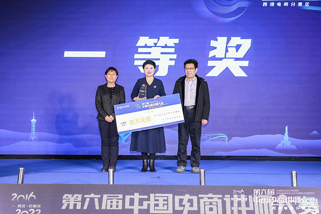 石家庄市商务局局长、党组书记王晓辉,中国电商讲师大赛专家评审委员会主席聂林海为荣获一等奖的选手颁奖