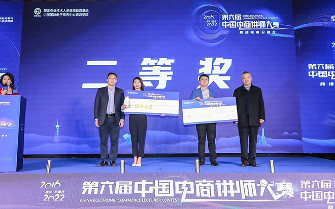 河北省商务厅对外贸易处二级调研员张增绪、中国国际电子商务中心培训学院院长李伟为荣获二等奖的选手颁奖
